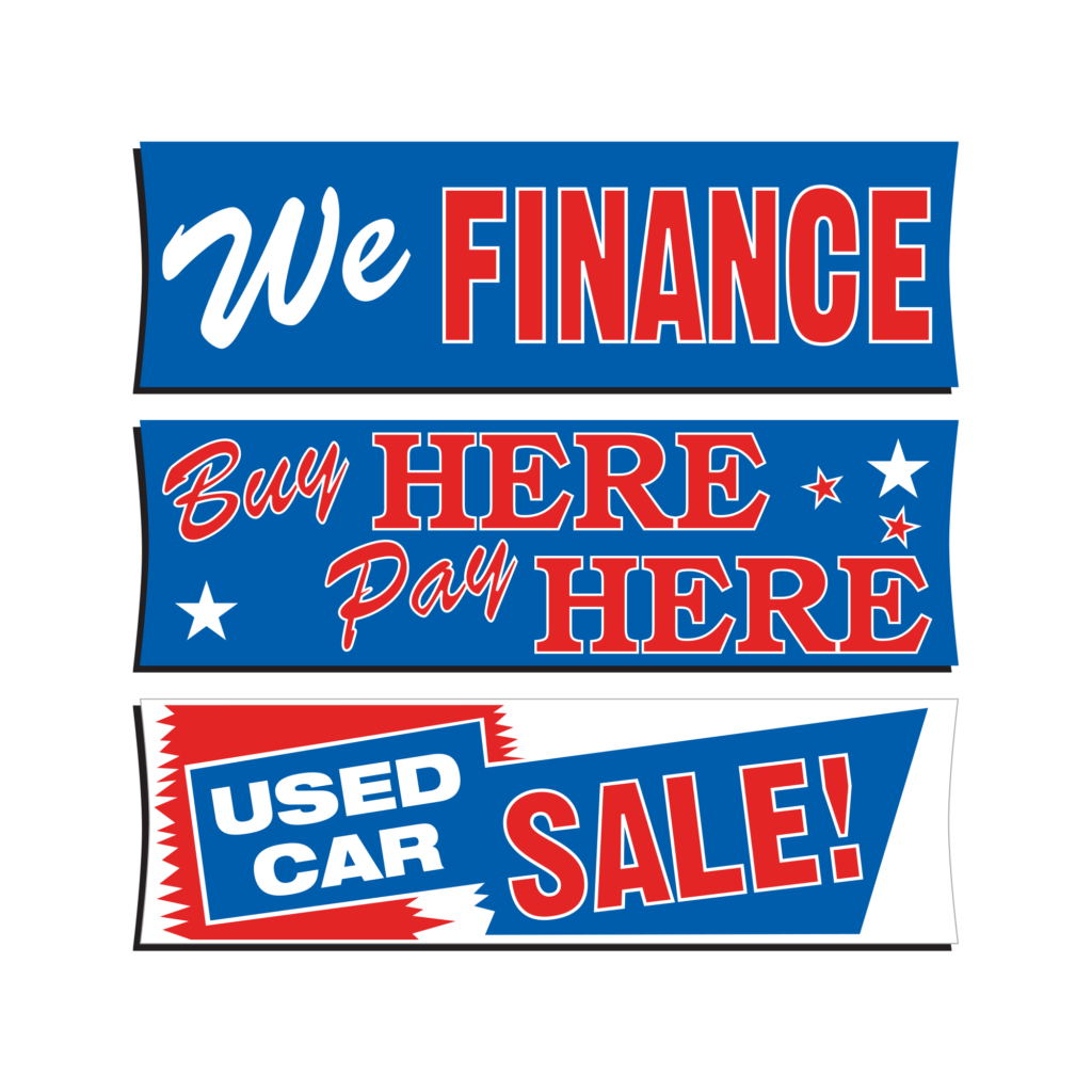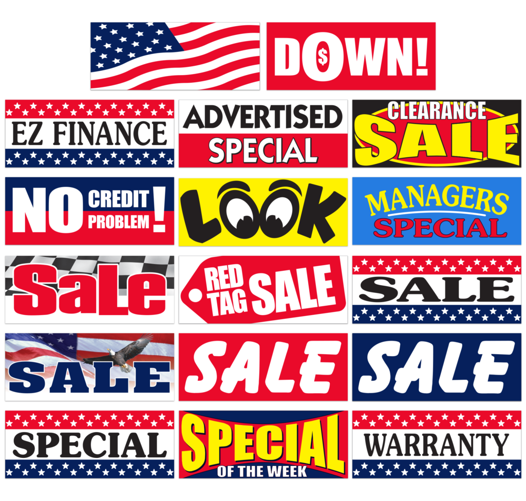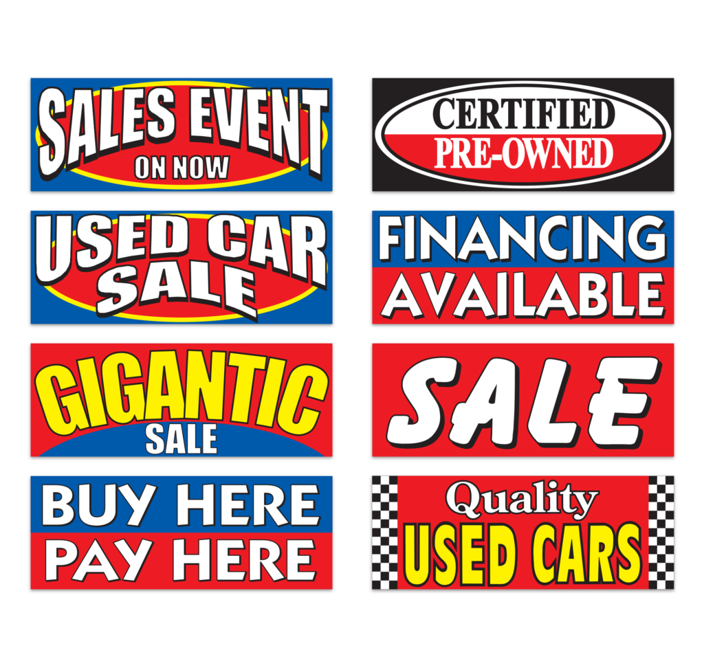Vizi™ Windshield Banners are perfect to grab the attention of your customers. These eye-catching banners are easy to install for display, and easy to remove for a test drive. Each banner is made of a heavy-duty reusable vinyl, and is reinforced for maximum durability. Just use the bungee cords to attach your banner to each of the side mirrors and you’re good to go!