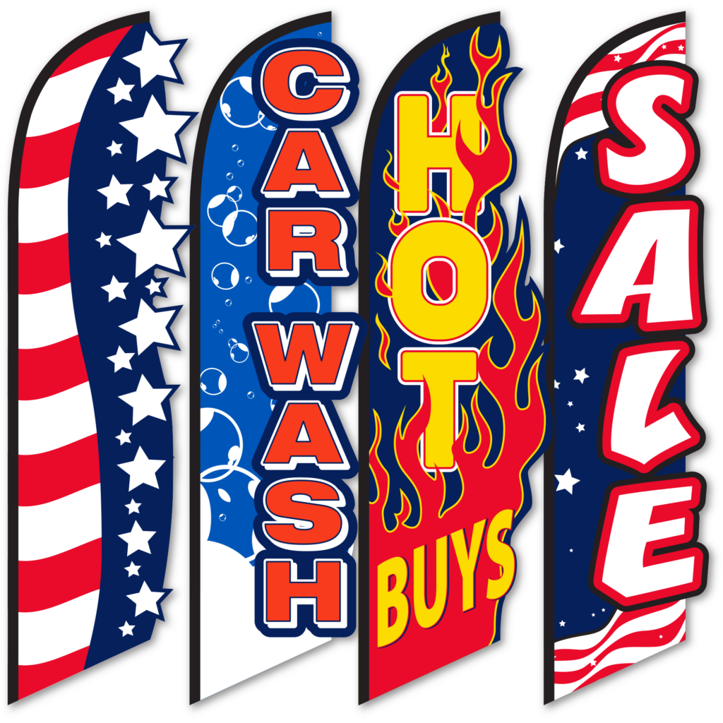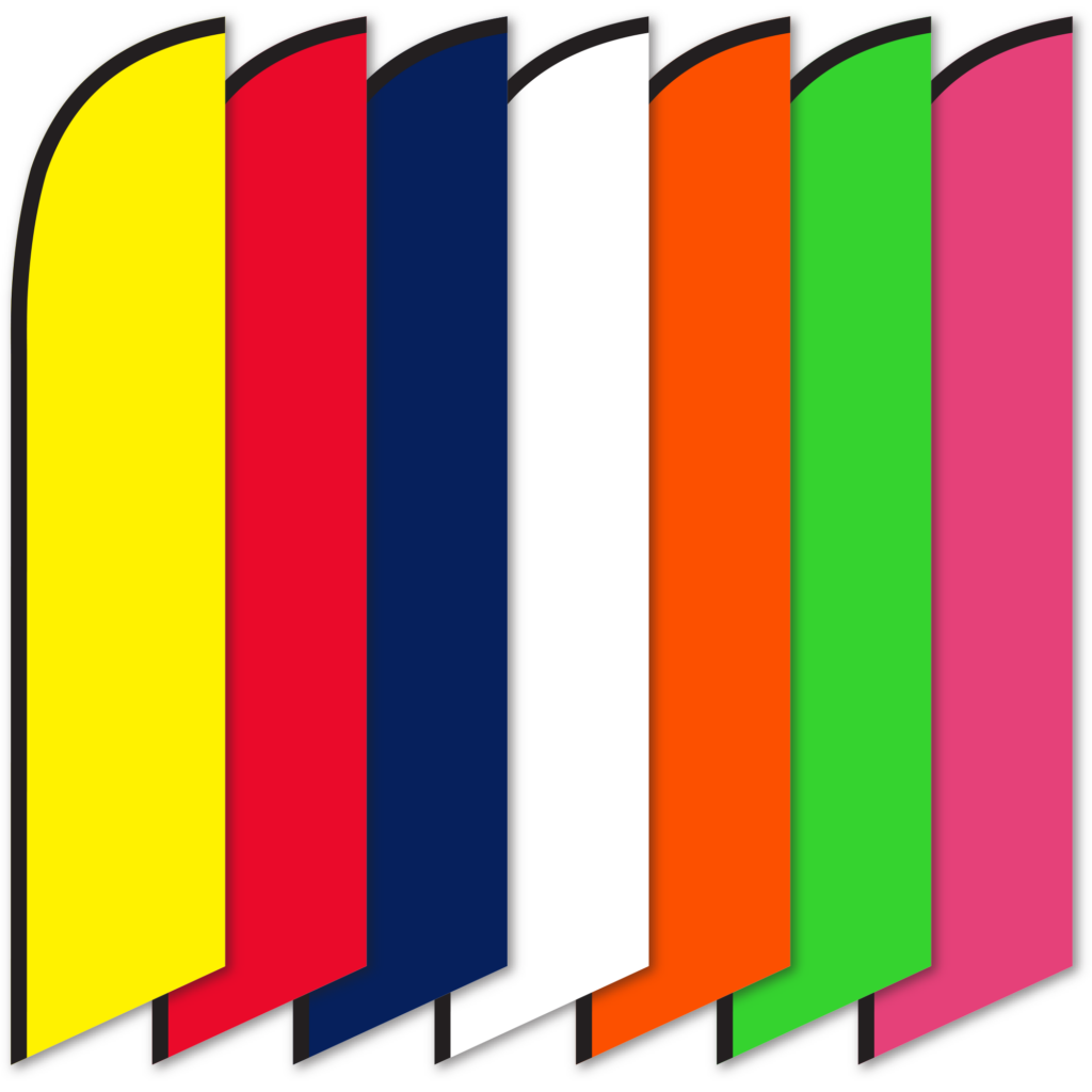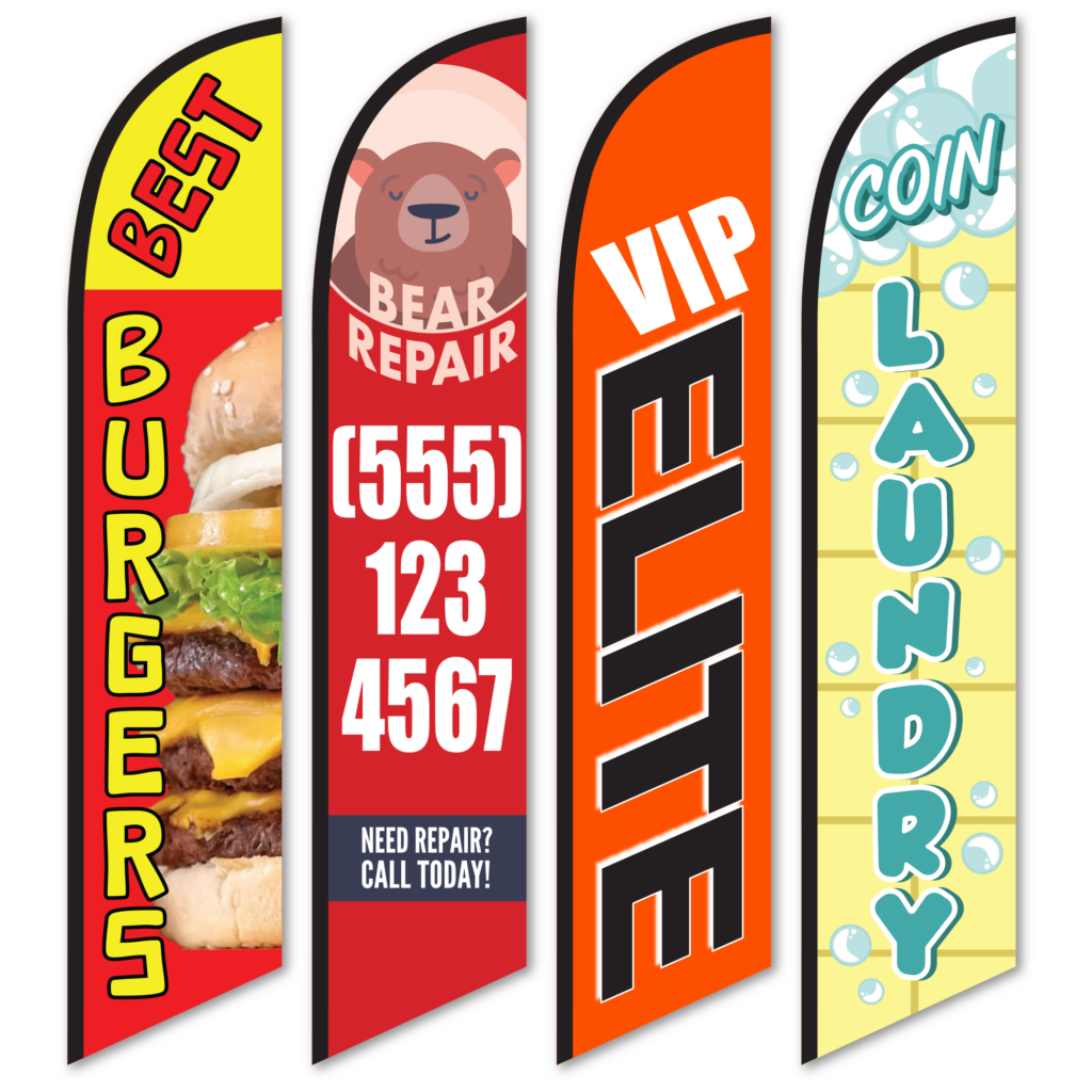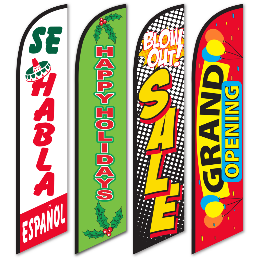 All of our flags have a sewn sleeve that fits up and over the arch of our four piece pole set. When mounted, each Swooper Flag reaches a height of over 15 feet, allowing for maximum visibility at all times. All of our stock Swooper Flags come in a wide range of colors and a variety of slogans.